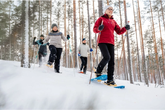 Talvisessa maisemassa liikkumiseen voi vuokrata myös lumikenkiä, joilla pääset helposti tutkimaan lähialueen rauhallista luontoa.